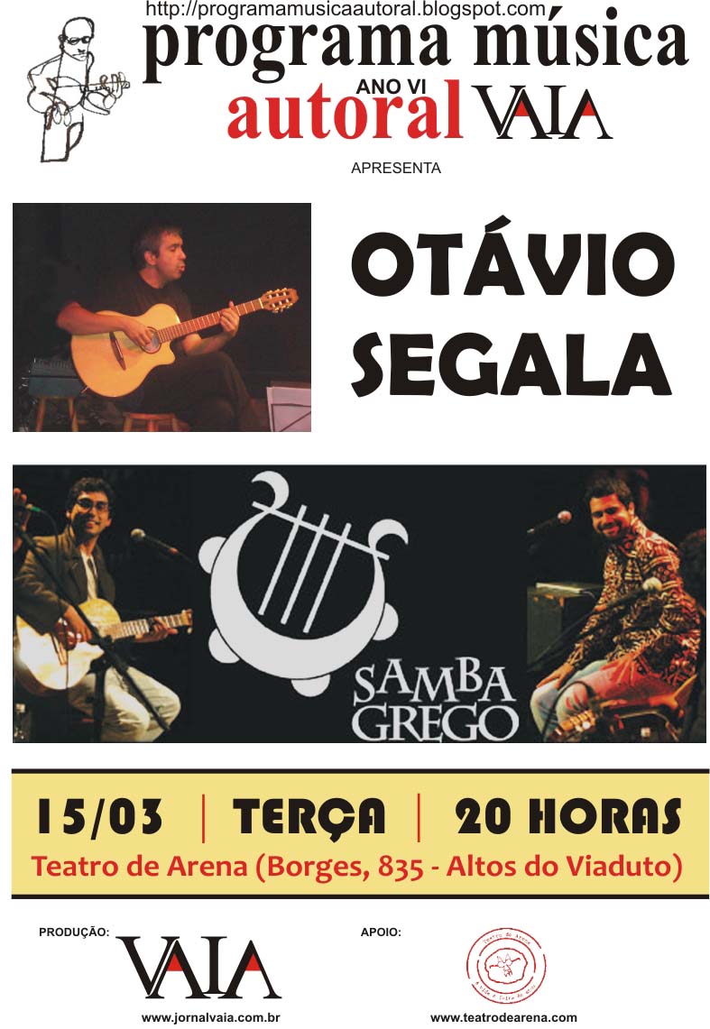 Convido vocês a assistirem as primeiras apresentações do Programa Música Autoral Vaia do mês de março, que acontecem em Porto Alegre, dia 15, no Teatro de Arena (Av. Borges de Medeios, 835 – Altos do Viaduto), a partir das 20 horas.