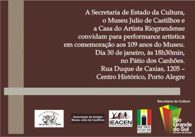 O Museu Julio de Castilhos comemora os seus 109 anos de criação na próxima segunda-feira (30), às 18h30min, em sua sede (Rua Duque de Caxias, 1205 – Centro Histórico). Uma especial representação histórica foi montada pelos moradores da Casa do Artista Riograndense para celebrar tão importante data, o aniversário de fundação deste museu que é o precursor em abrigar a história de nosso povo e nossas culturas.