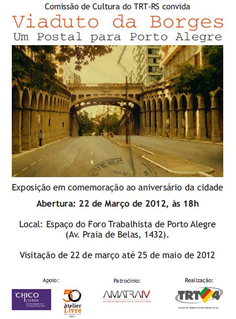 Em homenagem ao aniversário de 240 anos da Capital gaúcha, a Comissão de Cultura do Tribunal Regional do Trabalho do Rio Grande do Sul (TRT-RS) promove a exposição de arte postal “O Viaduto da Borges – Um Postal para Porto Alegre”. O lançamento ocorrerá em 22 de março, às 18h, no Espaço do Foro Trabalhista da Capital (Av. Praia de Belas, 1.432, saguão do prédio II – bairro Menino Deus).
