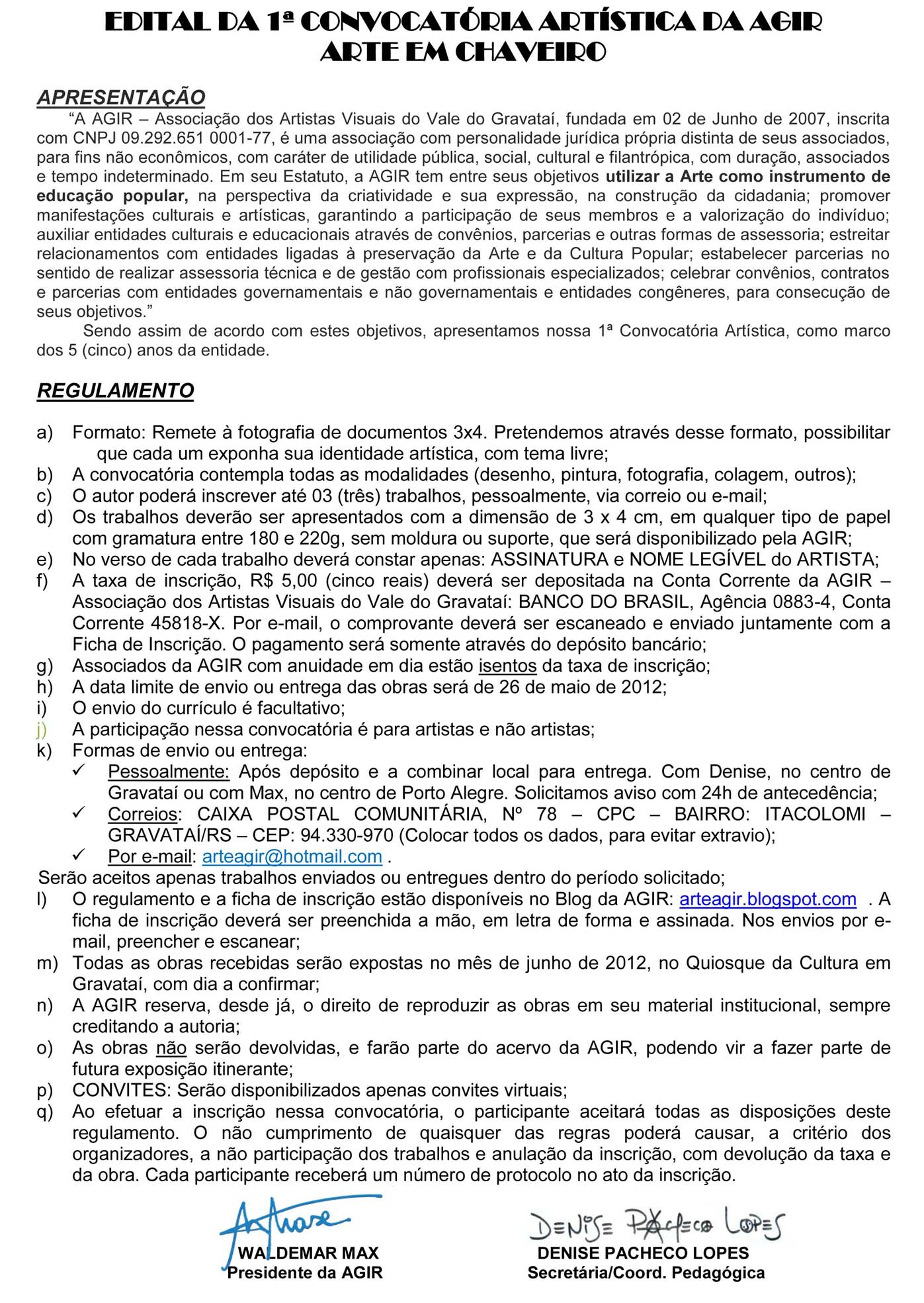 Presidente AGIR Assoc. dos Artistas Visuais do vale do Gravataí