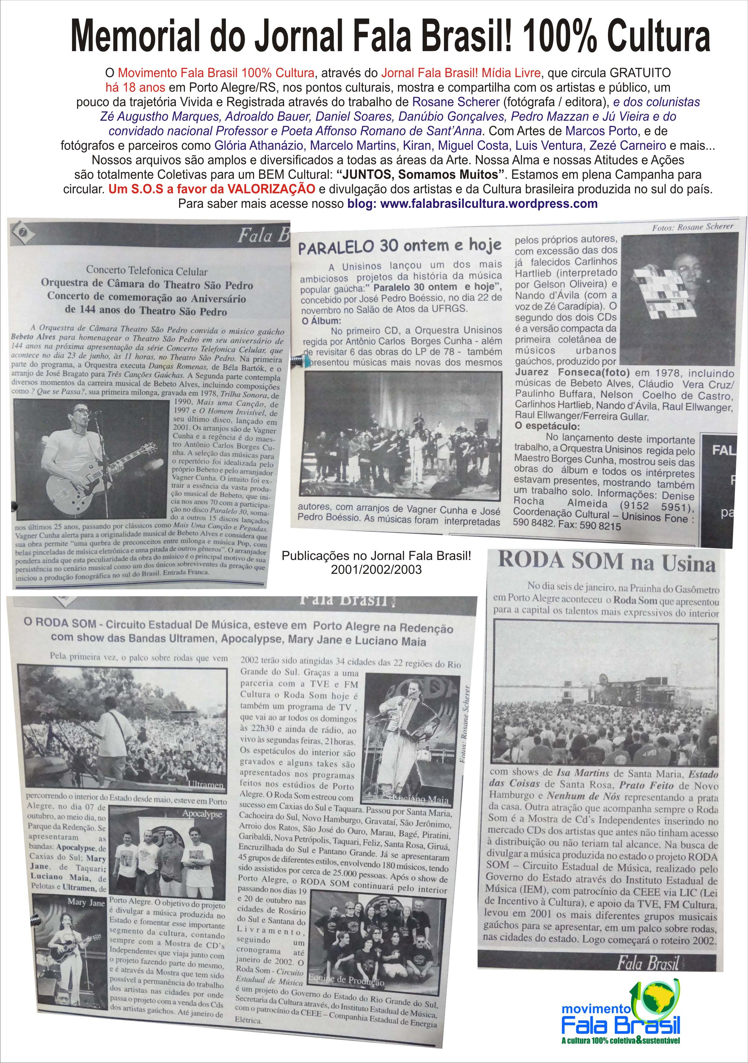 Gente, o Fala Brasil! é coisa de maluco! Daqueles que, desprendidos e despretensiosos, se jogam de cabeça na construção de um ideal… Acompanho a Rô Scherer há quase 18 anos e bem sei que, graças à sua determinação inesgotável, esse veículo vem registrando e divulgando toda a história cultural da nossa cidade. São milhares de fotos, incontáveis noites sem dormir – lendo, resumindo, escrevendo, diagramando, atendendo aos apelos da nossa classe artística por uma “janela” onde sua criação possa tornar-se conhecida e reconhecida, com o devido respeito; e isto toda a gente reconhece, esse é O VEÍCULO que dedica espaços a todas as tribos, todos os fazedores de cultura, músicos, bailarinos, teatrólogos, atores, escritores, artistas plásticos… com o mesmo tratamento respeitoso e despido de tendências político-partidárias.