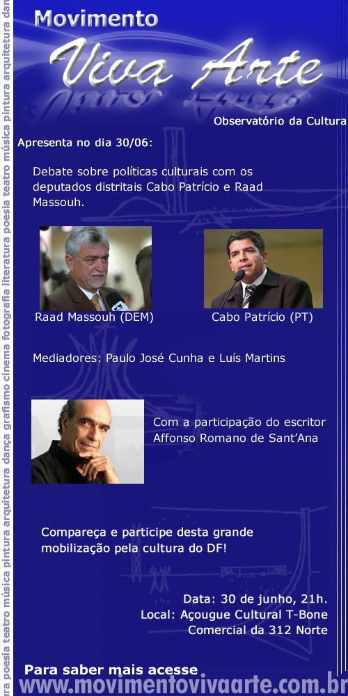 * Dia 30 de junho- 19,30-no Centro Cultural do T-Bone Cultural/Brasília, debate, lançamento LER O MUNDO ( Ed Global)