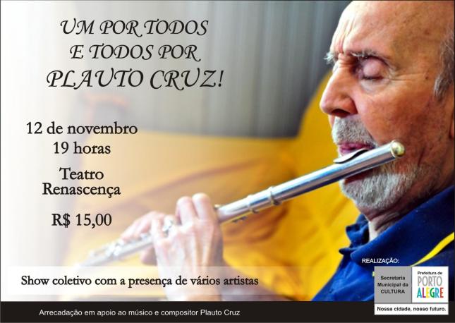 Um por Todos e Todos por Plauto Cruz é o nome do show beneficente que acontecerá dia 12 de novembro, às 19h, no Teatro Renascença (Av. Érico Veríssimo, 307) reunindo mais de 40 grandes músicos gaúchos listados abaixo.