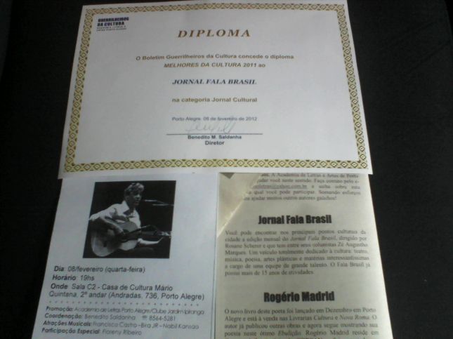 O jornal Fala Brasil! foi agraciado como o melhor Jornal Cultural de 2011 da Grande Porto Alegre, no dia 8.02.2012. O prêmio referido deu-se pelo empenho maior dos Guerrilheiros da Cultura (Academia de Letras e Artes de Porto Alegre) sob a direção de Benedito M. Saldanha. Na ocasião aconteceu o já reconhecido “Sarau com Ritmo” em homenagem a Caetano Veloso com expressiva presença da classe cultural na sala C2 da Casa de Cultura Mário Quintana, 2ºandar.
