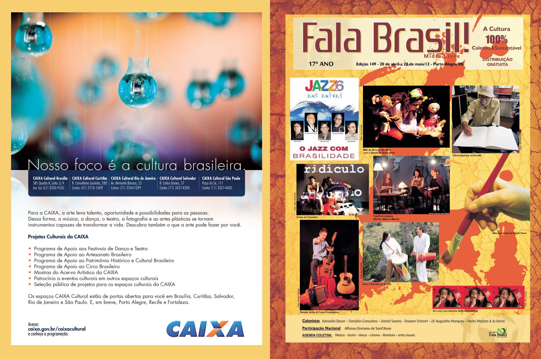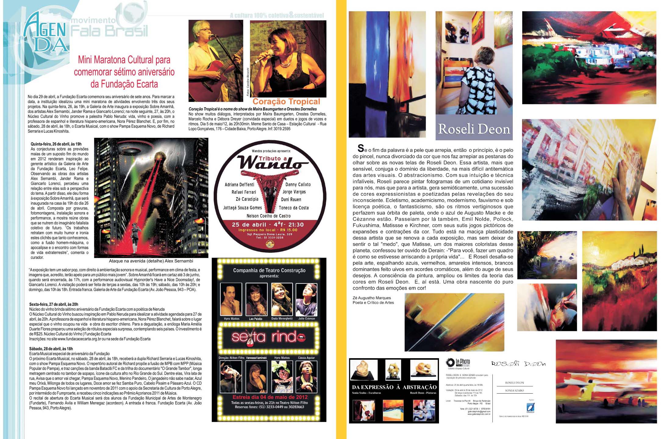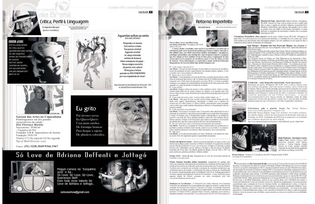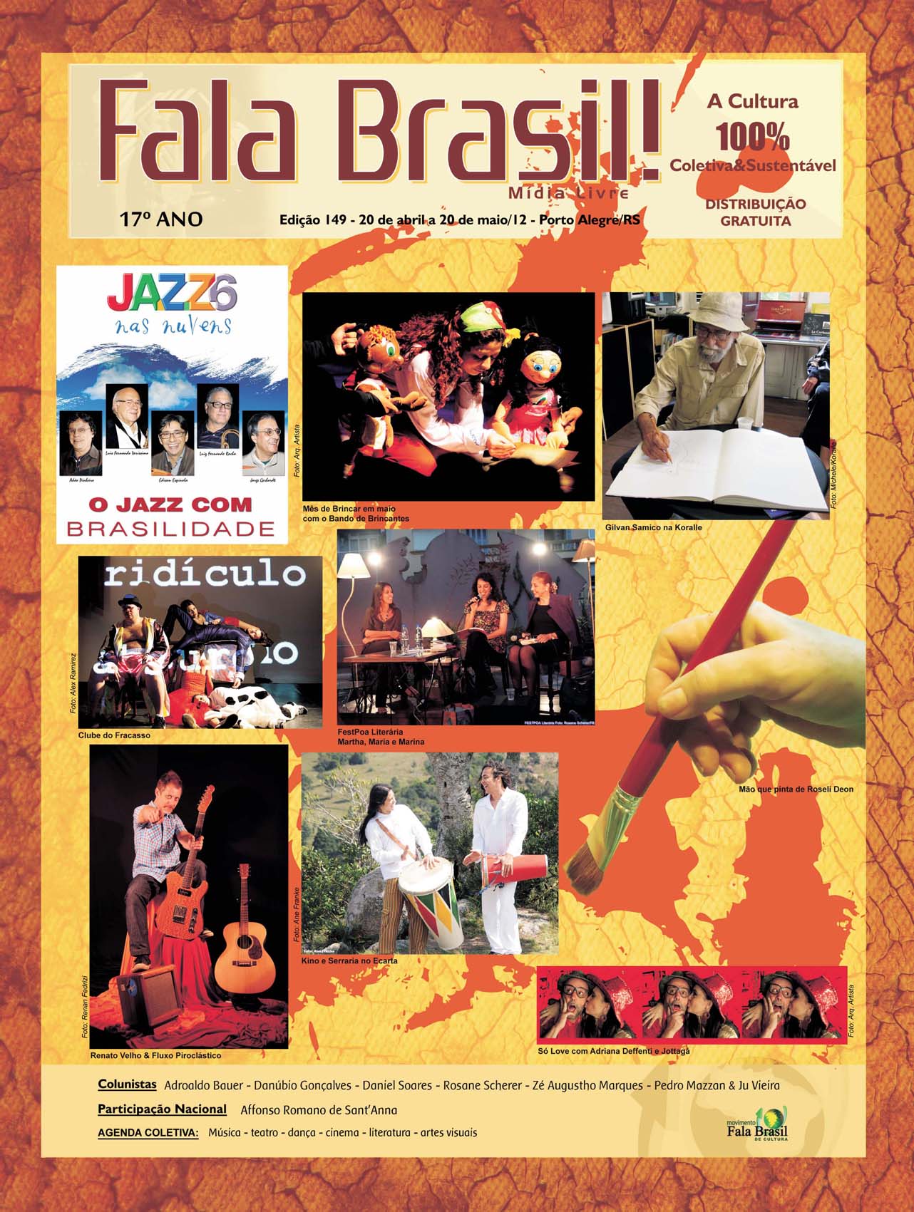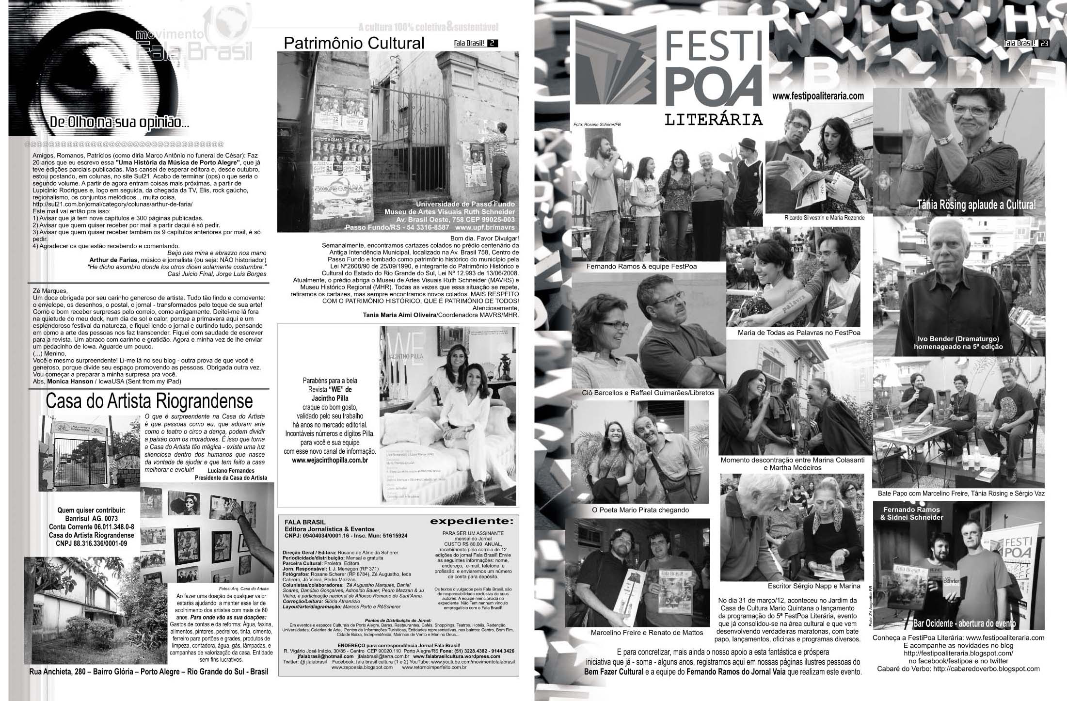 Hoje é Aniversário do JORNAL FALA BRASIL! Hoje parabenizamos todos os artistas e fazedores de arte, por estarem há 18 anos em nossas páginas iluminando a nossa cidade com Cultura!!! Obrigada a TODOS os apoiadores que estiveram com o Fala Brasil Cultura, seja incentivando, escrevendo, anunciando, lendo, opinando, criticando… Evoluímos, com certeza juntos! E hoje mais ainda, amadurecidamente, acredito cada vez mais na Cultura & na Arte como forma de humanizar as pessoas. Agradeço especialmente a todos os Fazedores do Fala, mês a mês… Marcos Porto, Glória Athanázio, Ieda Leonor Toscani Cabrera, Zé Augustho Marques, Daniel Soares, Danúbio Gonçalves, Adroaldo Bauer Corrêa, Pedro Mazzan, Ju Vieira, e nosso querido amigo e grande poeta Affonso Romano Santanna… É um grande privilégio estar e conviver com pessoas tão maravilhosas, talentosas e Arteiras… ACENDA A LUZ. Embarque no Trem 150 da Movimento Fala Brasil 100% Cultura…